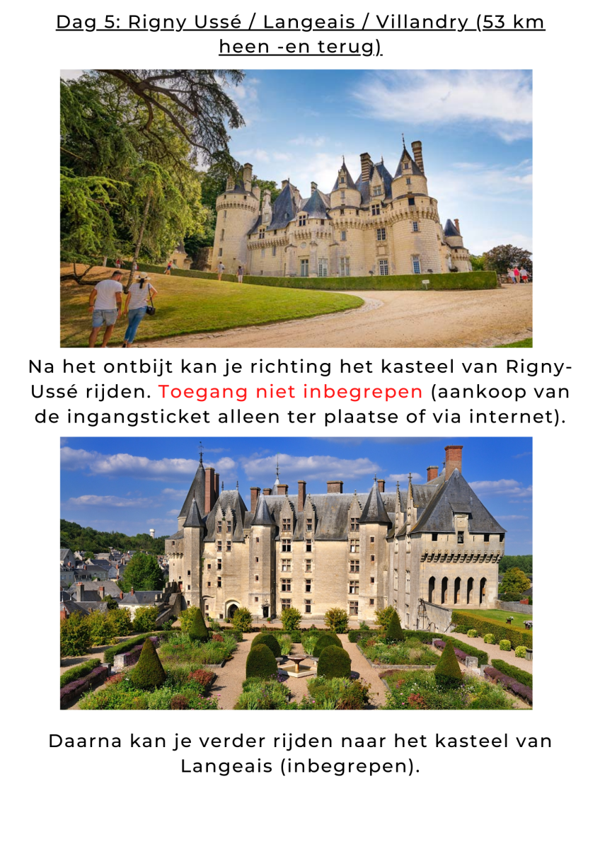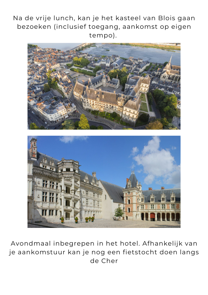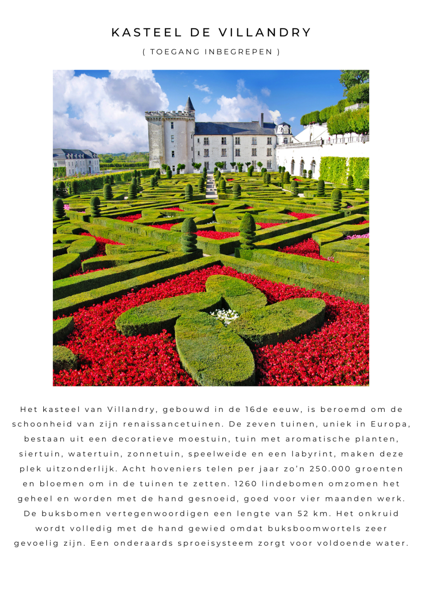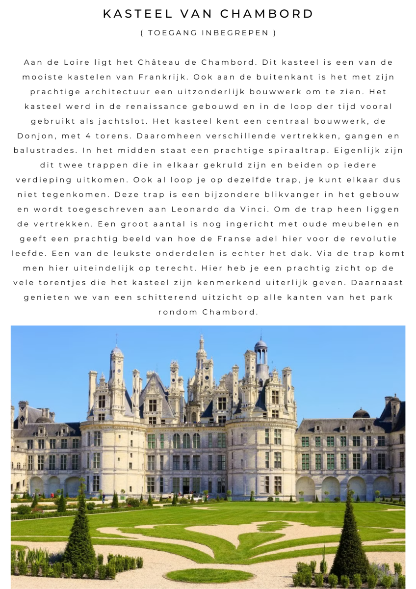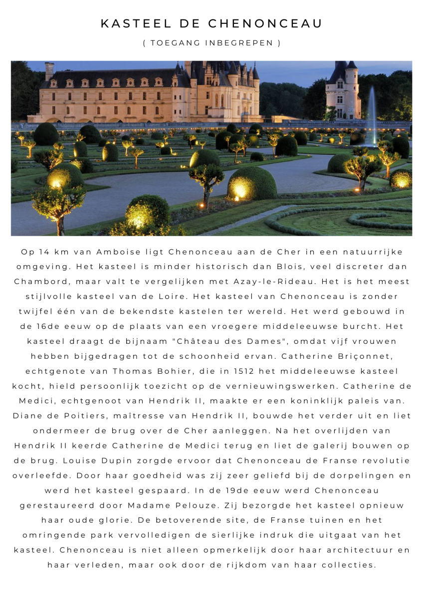 * 7 kasteelbezoeken: Blois, Chambord, Royal d'Amboise, Chenonceau, Villandry, d'Azay-le-Rideau & de Langeais