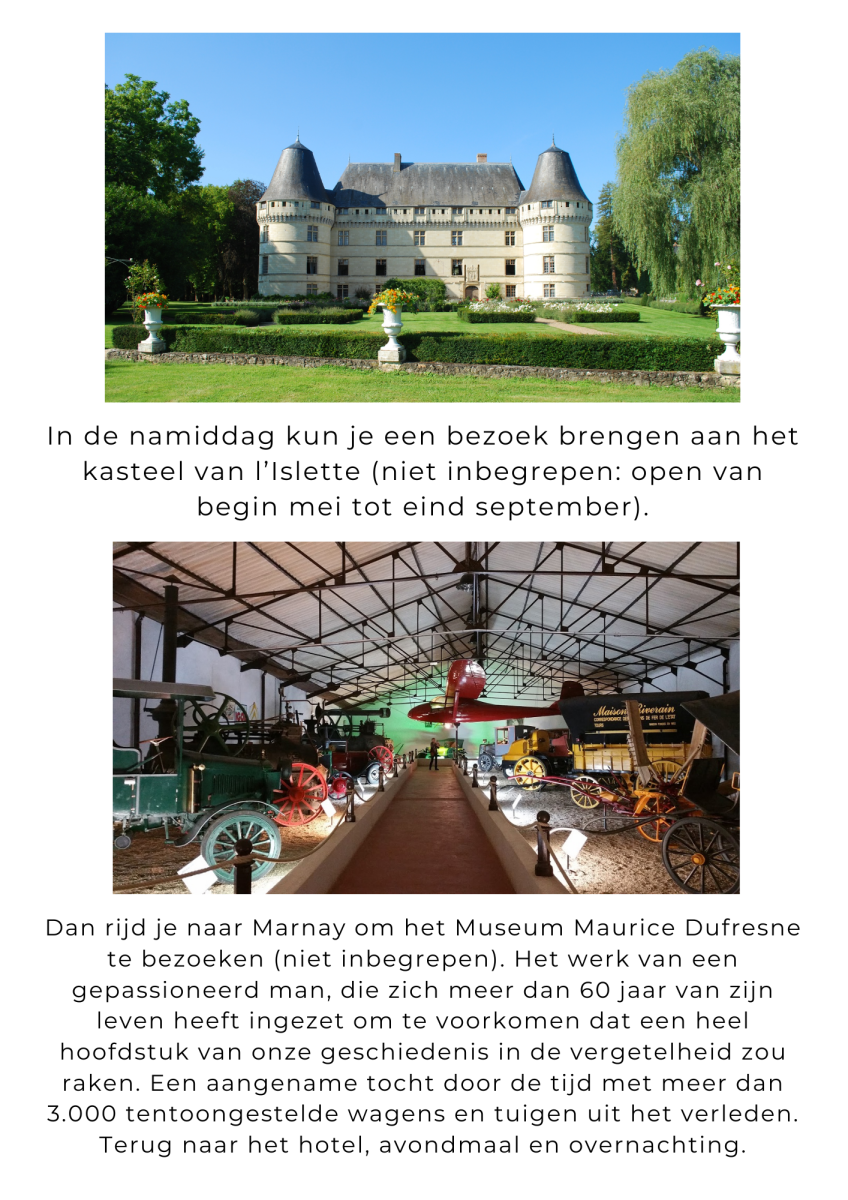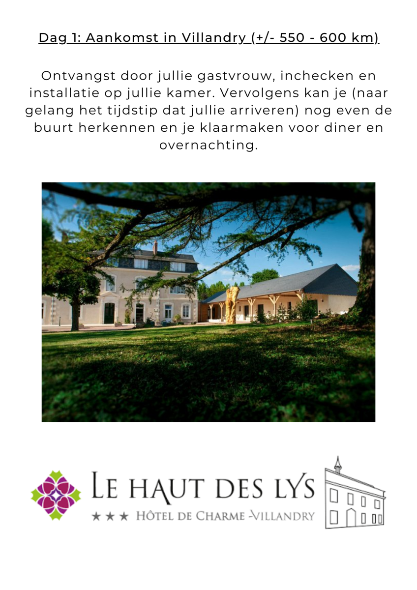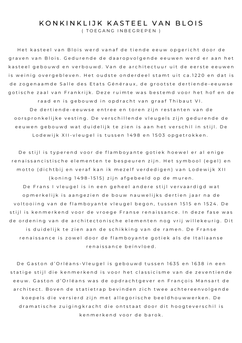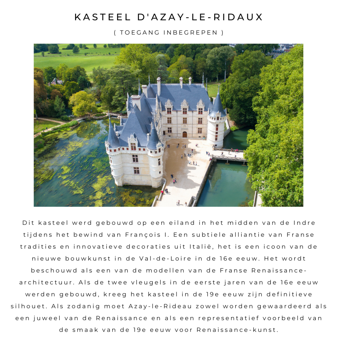 * 7 kasteelbezoeken: Blois, Chambord, Royal d'Amboise, Chenonceau, Villandry, d'Azay-le-Rideau & de Langeais