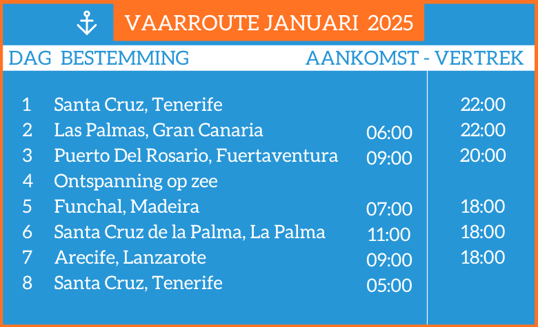VAARROUTE VERTREKKEN 05/01/2025, 12/01/2025 & 19/01/2025