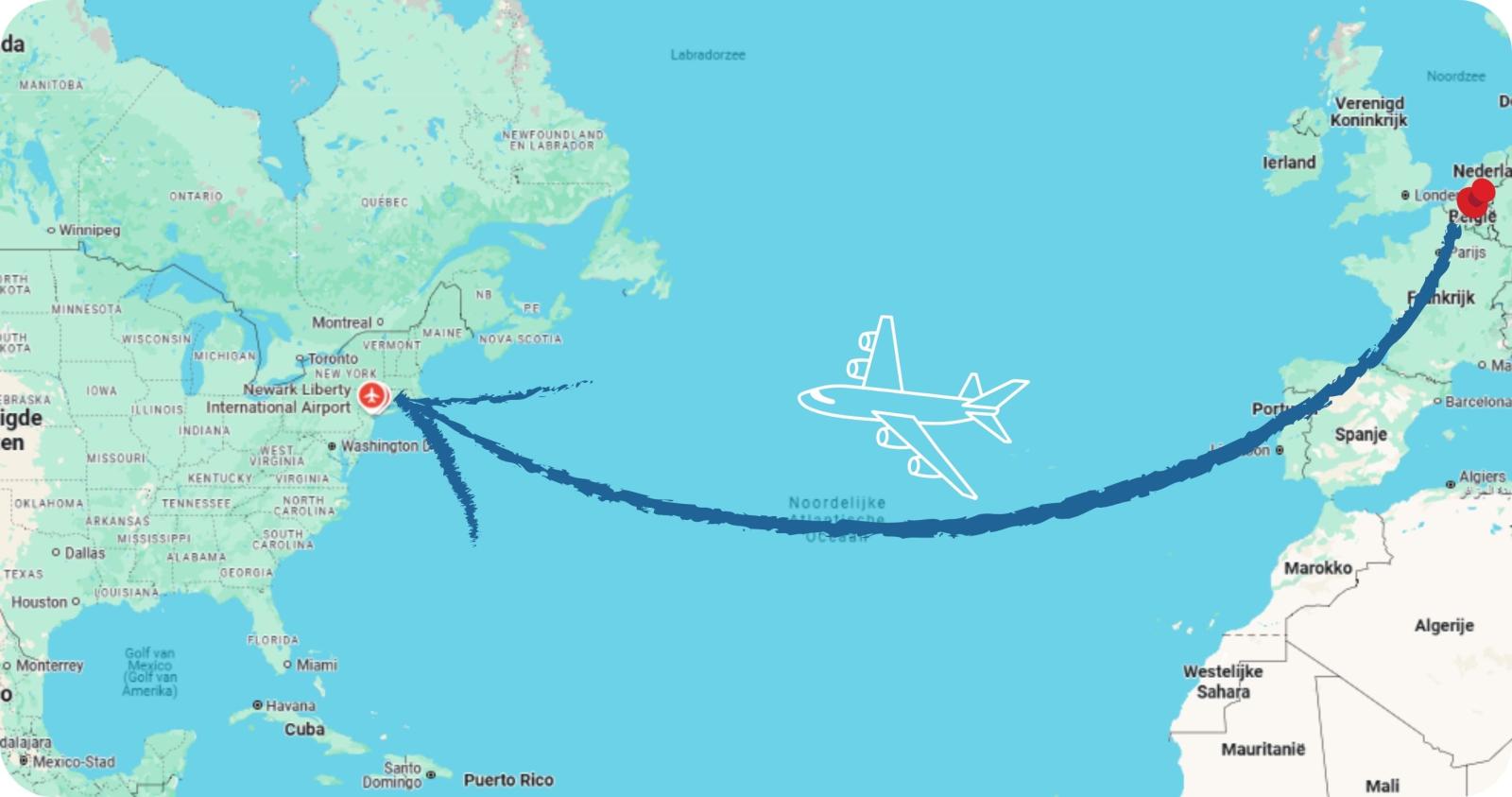 Rechtstreekse vlucht naar Amsterdam om 17u lokale tijd. In Amsterdam overstappen op de vlucht naar Brussel.