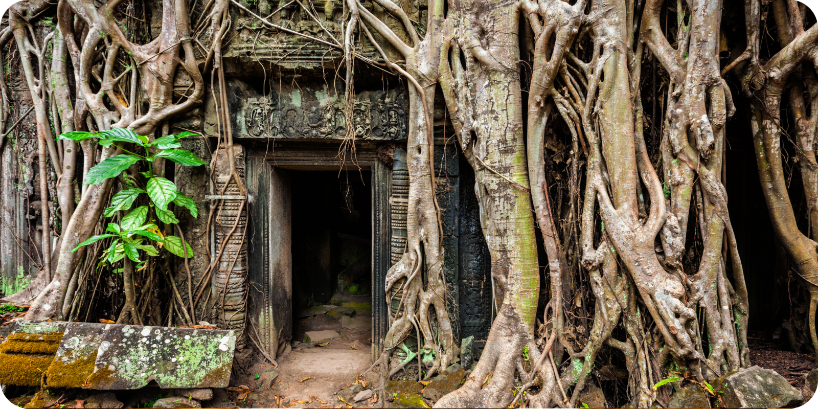 Ta Keo, Banteay Kdai en Ta Prohmtempel die helemaal overwoekerd is door tropische vegetatie.