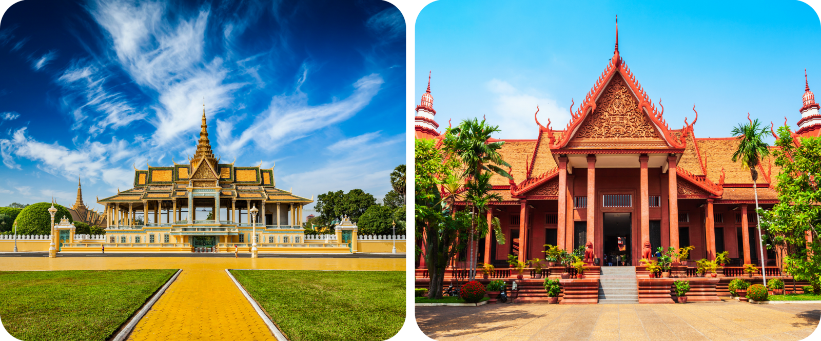 Riksjaritje door de stad in de ochtend. Bezoek van het Koninklijk Paleis, een enorm architecturaal geheel met de Zilveren pagode.