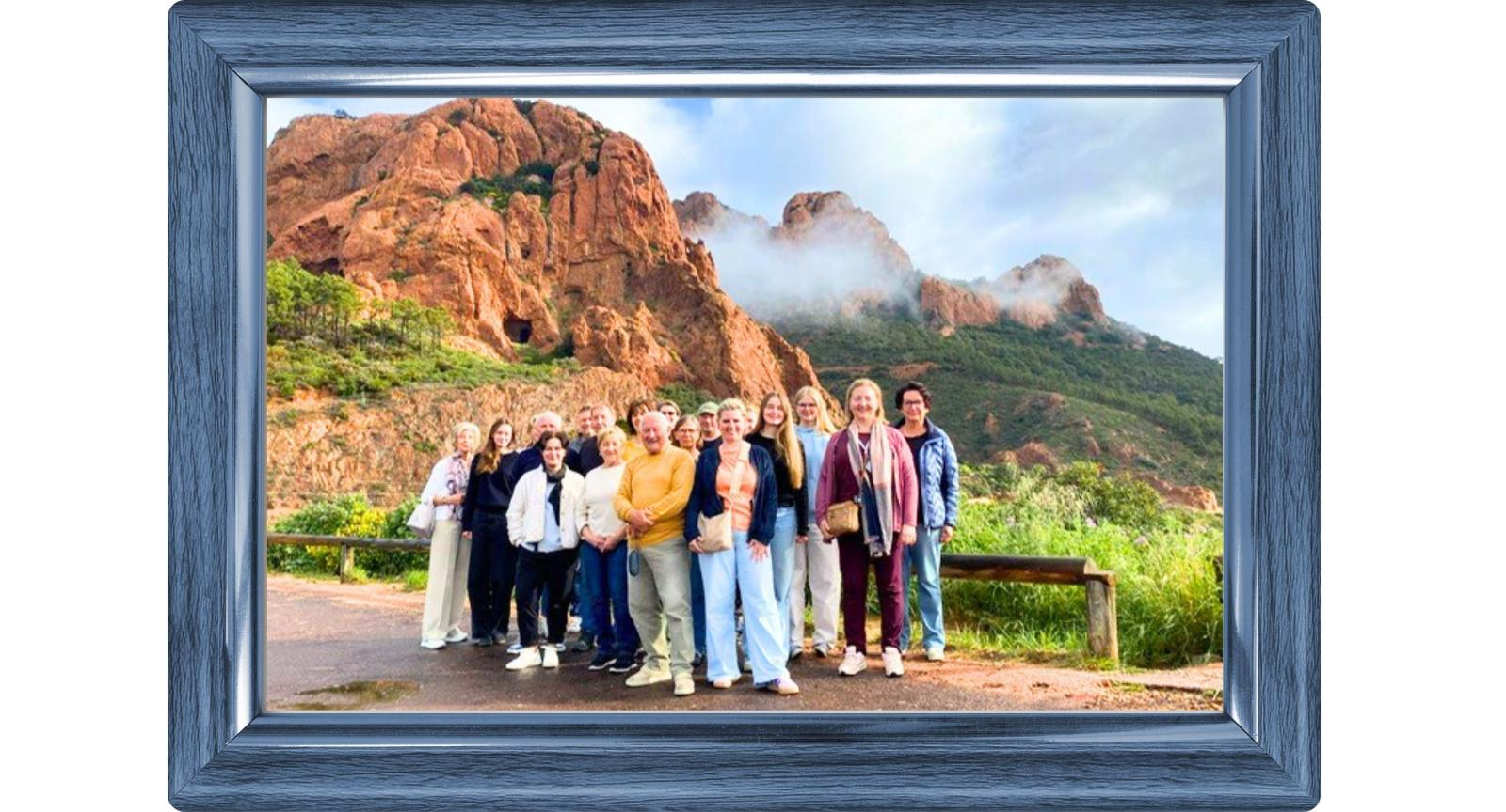 Een leuke groepsfoto van onze Blauwe Vogeltjes met op de achtergrond Le Massif de l'Esterel