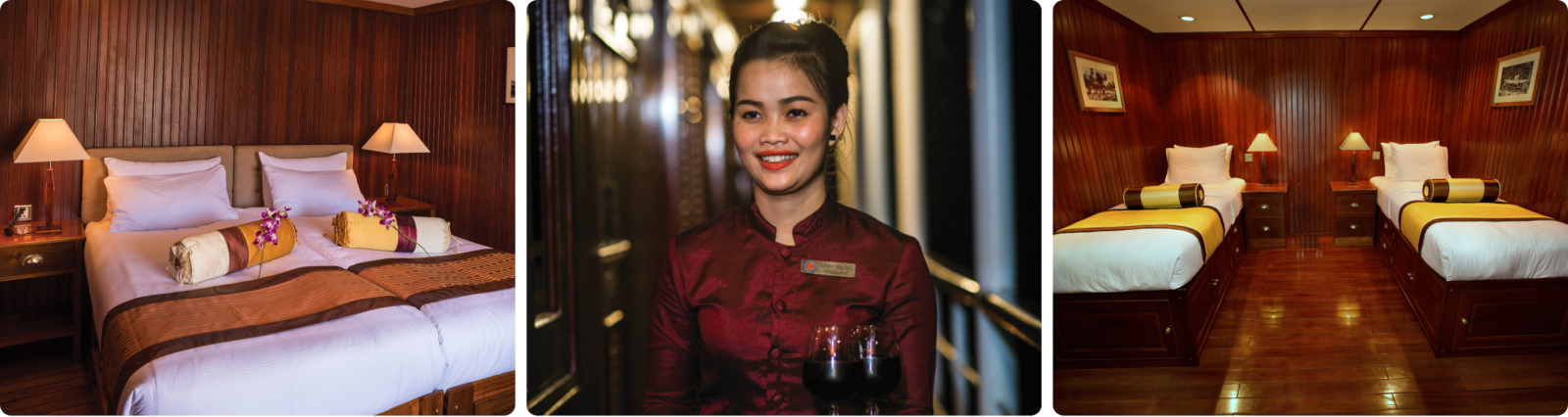 Welkom aan boord van de R/V Angkor Pandaw, een karaktervol boutique schip met slechts 16 buitengeoriënteerde kajuiten.