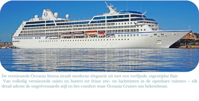 De Oceania Sirena biedt een intieme en elegante cruise-ervaring met een capaciteit van 684 passagiers. Het schip is volledig gerenoveerd en straalt een klassieke charme uit met moderne accenten. Geniet van de verfijnde sfeer, uitstekende service en culinaire hoogstandjes aan boord
