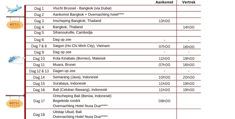 *Internationale vluchten : Brussel – Bangkok / Bangkok – Brussel via Dubai *Transport van en naar de luchthaven en cruiseschip *1 overnachting met ontbijt in hotel **** te Bangkok voor de cruise *2 overnachtingen met ontbijt in hotel Nusa Dua***** te Bali na de cruise *15-daagse adembenemende cruise langs de mooiste aanleghavens van Thailand, Vietnam en Indonesië *14 nachten aan boord van het prachtige schip Oceania Sirena *Nederlandstalige begeleider gedurende de volledige reis *Animatie, shows, fitnessruimte en entertainment aan boord *Volpension tijdens cruise (ontbijt, lunch, diner in het à la carte restaurant) *Inclusief wijn, bier & champagne tijdens lunch en diner *$250 boordtegoed per hut *Your World Included *Gastronomische specialiteitenrestaurants *24u in stateroom/suite roomservice *onbeperkte Starlink Wifi *Frisdranken, vruchtensappen, koffie- en theespecialiteiten *Bruisend of niet-bruisend Vero Water *Vers bereide smoothies of ijsspecialiteiten *Fitnesslessen in groep *Fooien voor het toegewijd personeel *Wasserij Service *Butler service (suites) *Havengelden en Taxen *Btw en garantiefonds
