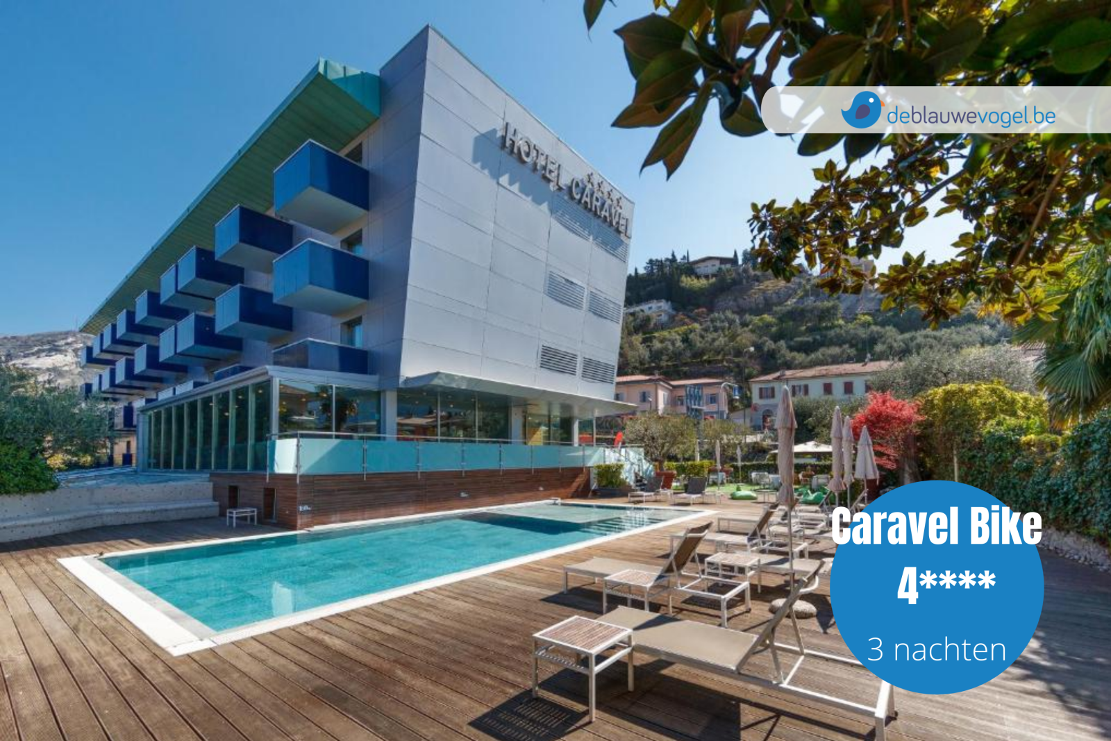 Hotel Caravel ligt in Torbole, een klein stad op de hellingen van de Monte Baldo, de bergketen die rondom het meer ligt.