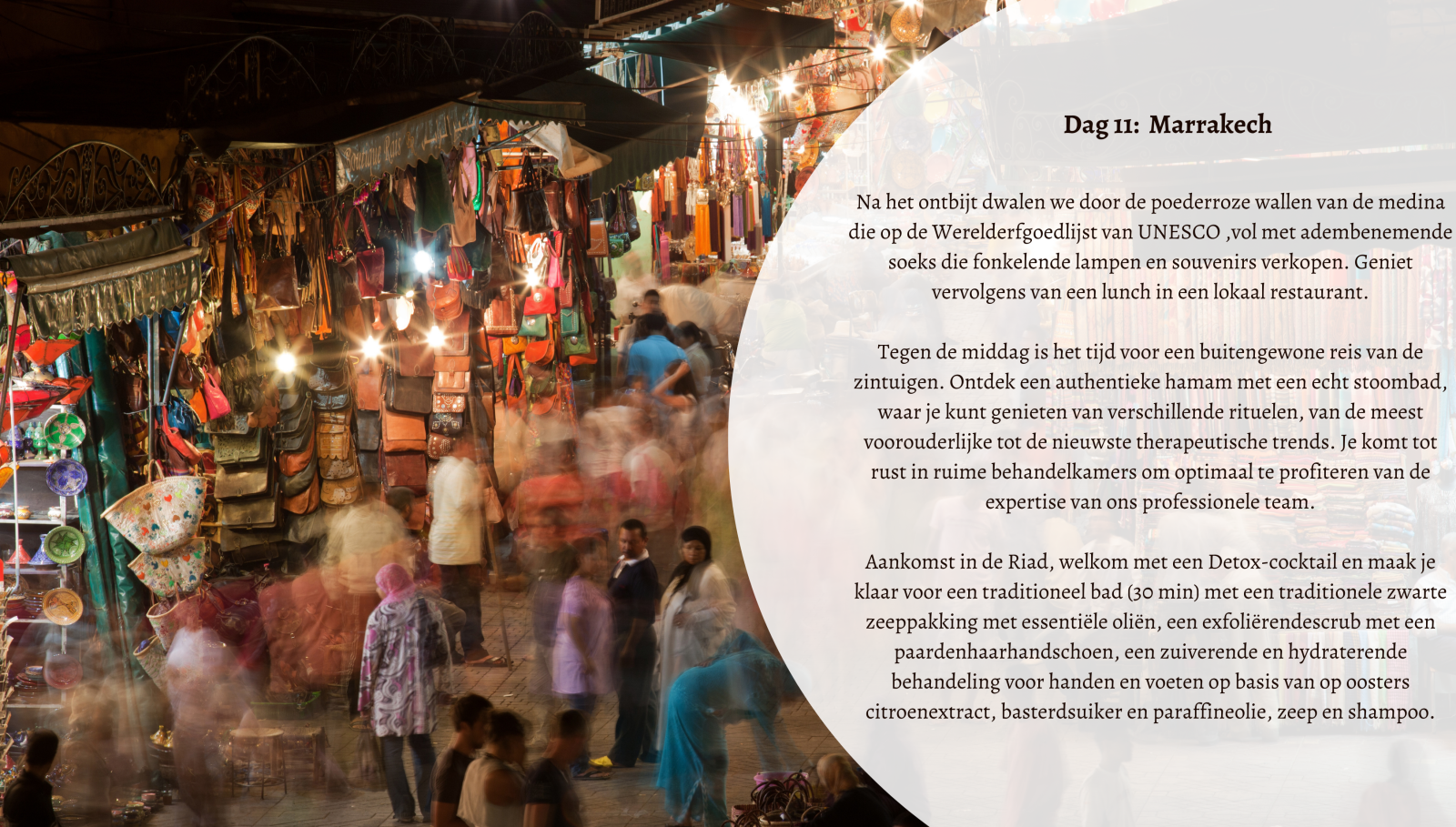 * Sluit je tour af met een pure tijd van ontspanning in een traditionele Marokkaanse hammam en massage