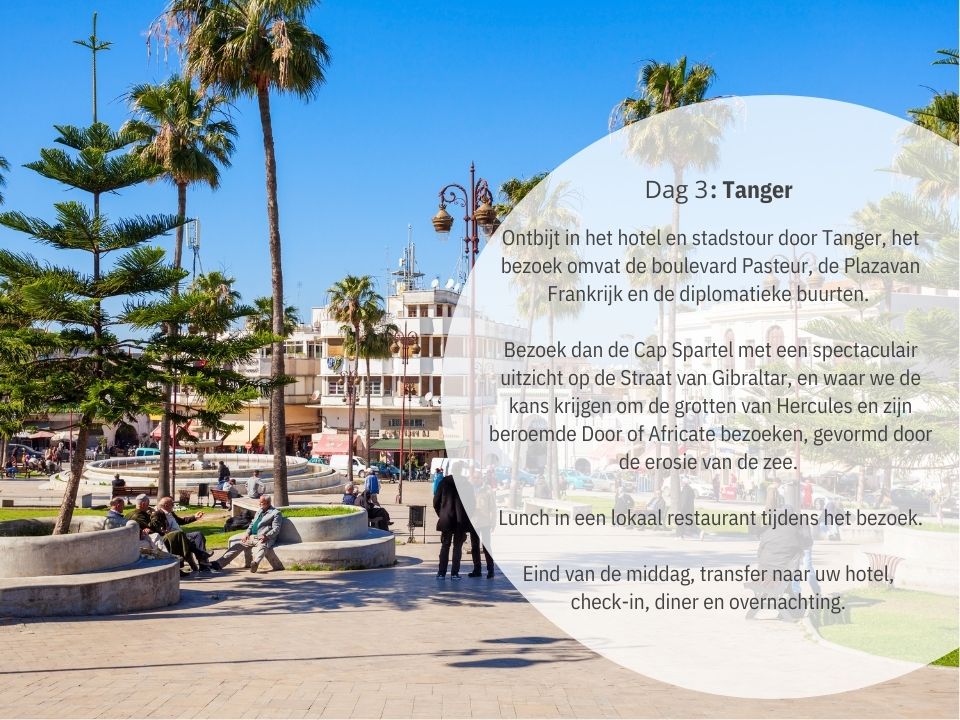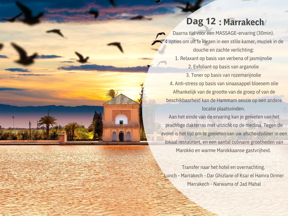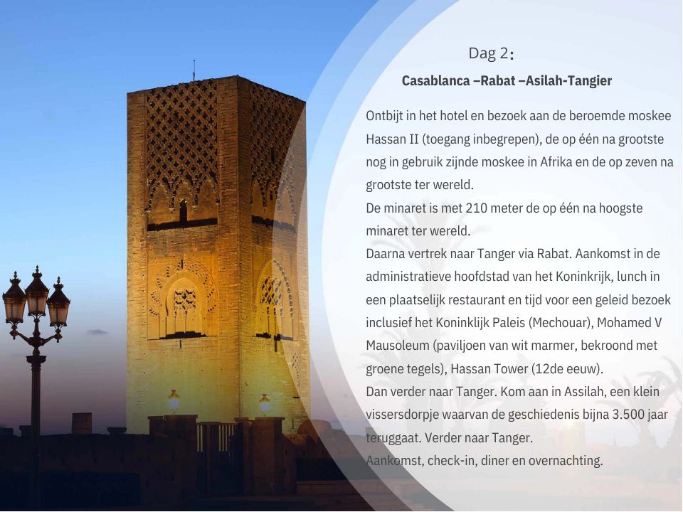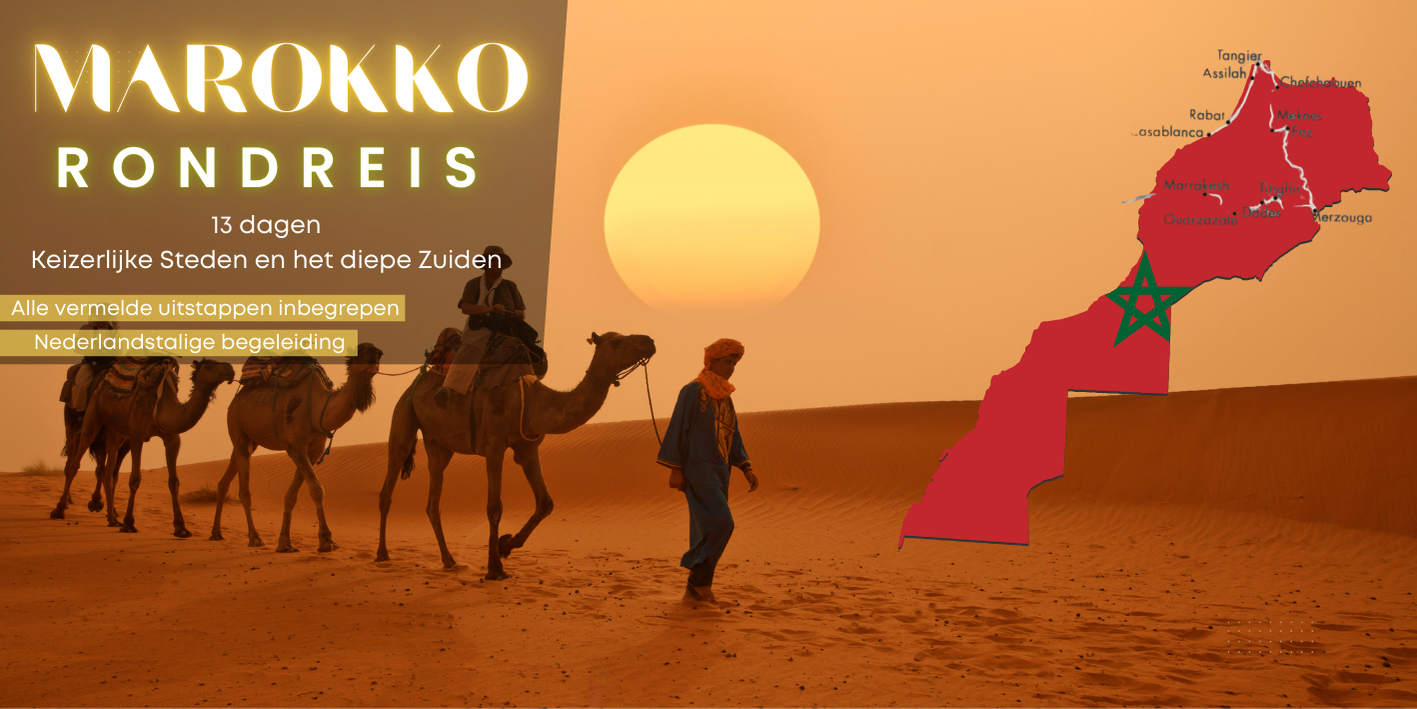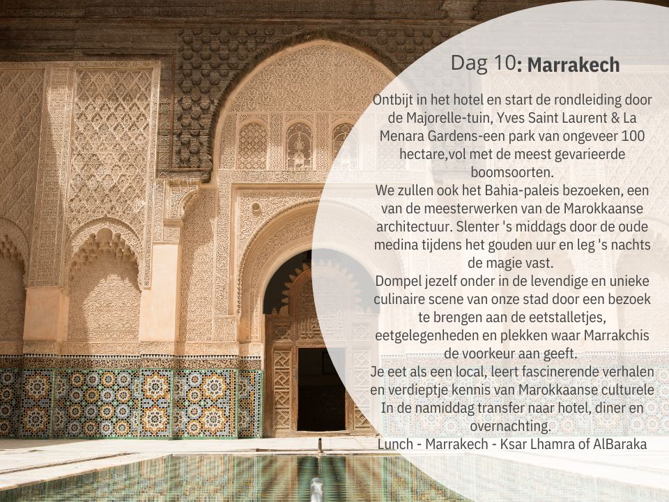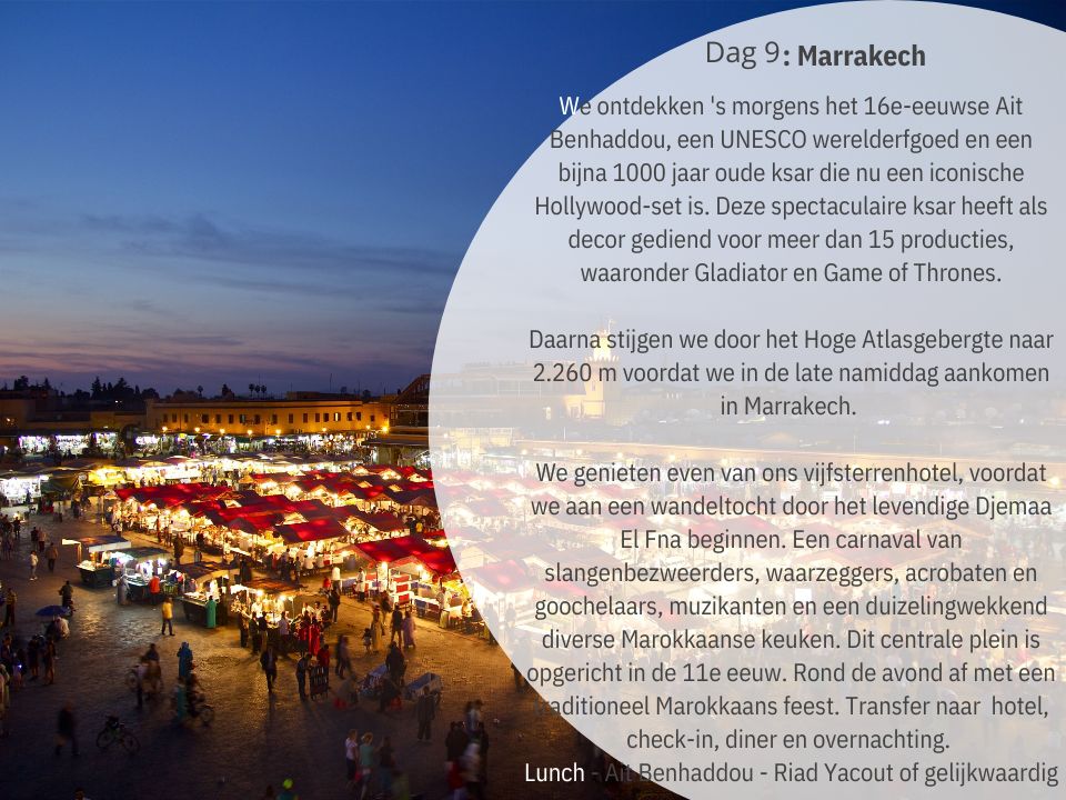 * Vluchten vanuit Brussel * 5 * * * * * hotels gedurende de rondreis * excursies en inkomgelden * Nederlandstalige gids ter beschikking de hele rondreis ter plaatse * De diensten van een deskundige lokale, Engelssprekende gids ter plaatse * Bijzonder complete totaal-rondreis * Verblijf in geselecteerde accommodaties (één 4**** Superior en 5*****) * Volpension; 11 lunches en 3 diners in lokale restaurants volgens het programma 8 topdiners in de verschillende hotels * Rondleiding door de Hassan II-moskee, één van 's werelds grootste en hoogste moskeeën * 4WD Sahara Desert-safari (5 Pax per voertuig) en kameelrit bij zonsondergang * Iconische 'Weg van 1.000 Kasbahs' * Bezoek de 1000 jaar oude Aït Benhaddou, die op de werelderfgoedlijst van UNESCO staat * Verken de 11e-eeuwse Djemaa El Fna-markt * Reis naar het Yves Saint Laurent Museum en de Majorelletuin * Slaap onder de sterren in luxe tenten in de Sahara * Sluit je tour af met een pure tijd van ontspanning in een traditionele Marokkaanse hammam en massage * Alle transfers ter plaatse in privévervoer met airconditioning * Alle toegangsprijzen volgens het programma