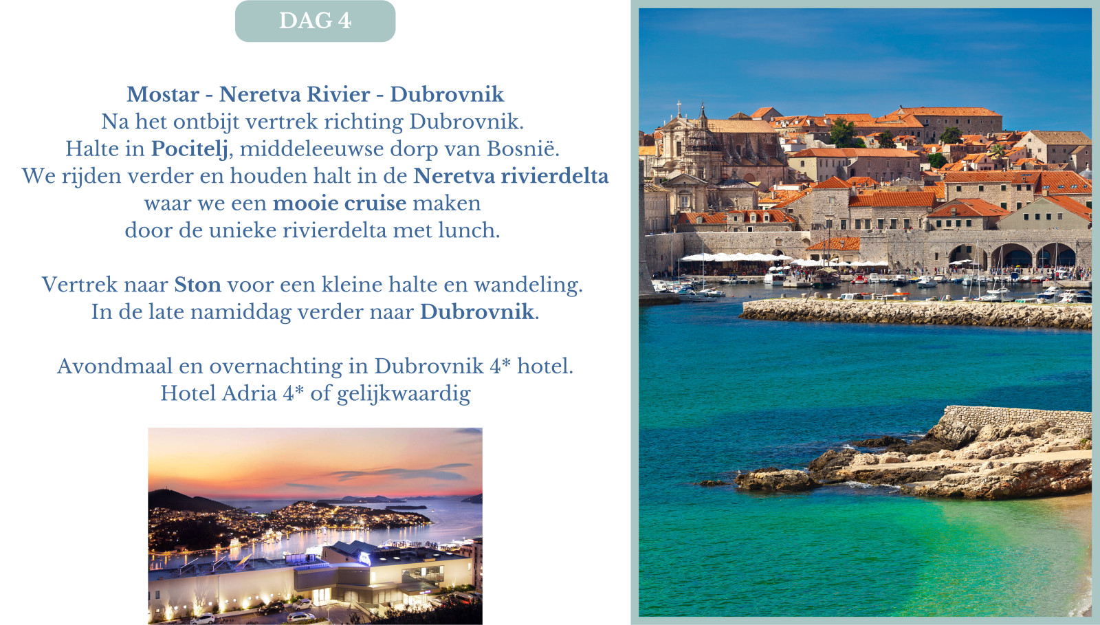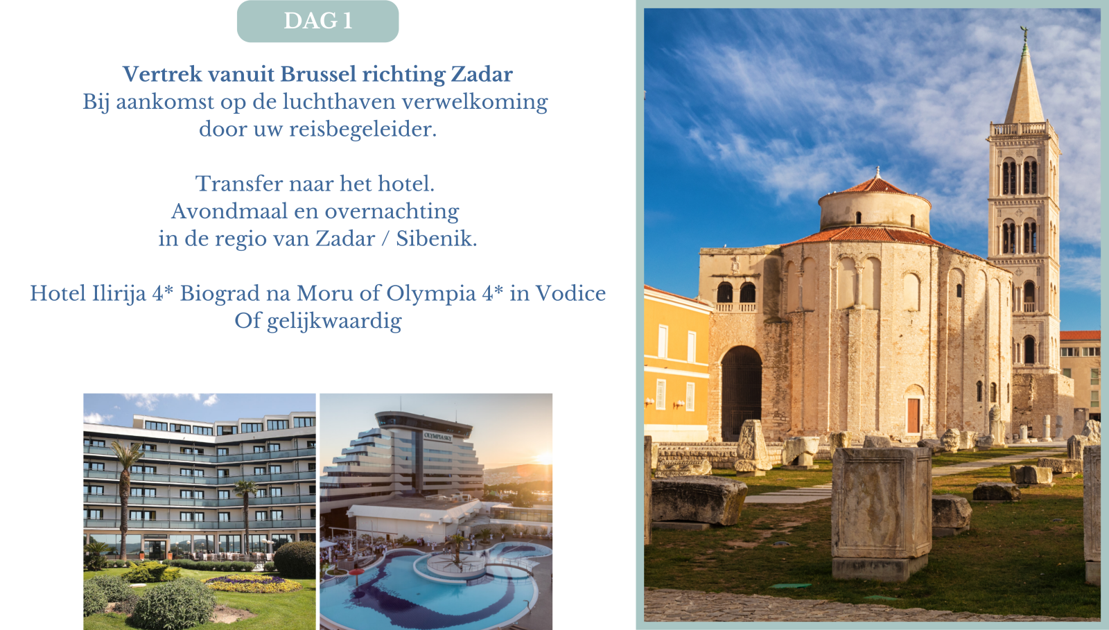 * Vliegreis heen / terug RECHTSTREEKS (Brussel -> Kroatië // Kroatië -> Brussel) * Uiterste complete rondreis * Volpension * Drank tijdens de lunch ( water en wijn ) * Alle excursies & inkomgelden * Nederlandstalige gids * Comfortabele airco autocar * Steeds centraal gelegen hotels