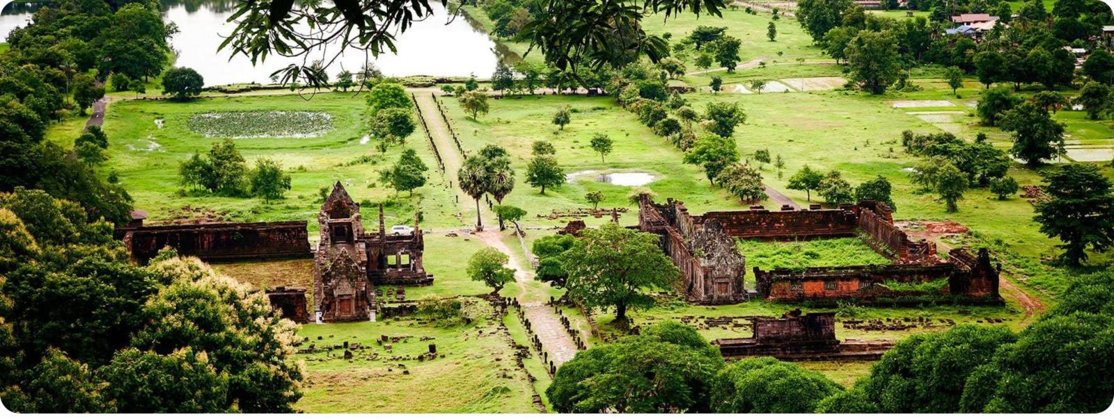 een spectaculaire pre-Angkorische tempel temidden van de rijstvelden en waterwegen van Zuid-Laos. Deze site