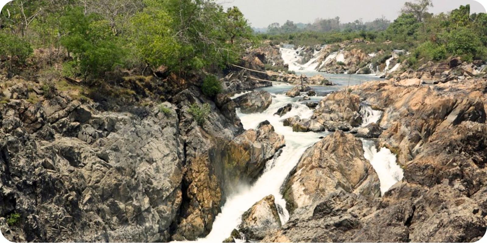 Laos, Cambodja en Zuid-Vietnam. Om de watervallen over te steken werden een brug en een spoorweg aangelegd.