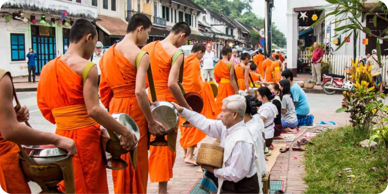 Elke ochtend ziet men er de bedelende monniken door de stille straten lopen op zoek naar hun aalmoezen