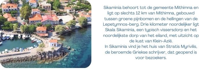 Het eiland staat bekend om zijn pittoreske dorpjes zoals Molivos, met zijn middeleeuwse kasteel en geplaveide straatjes,