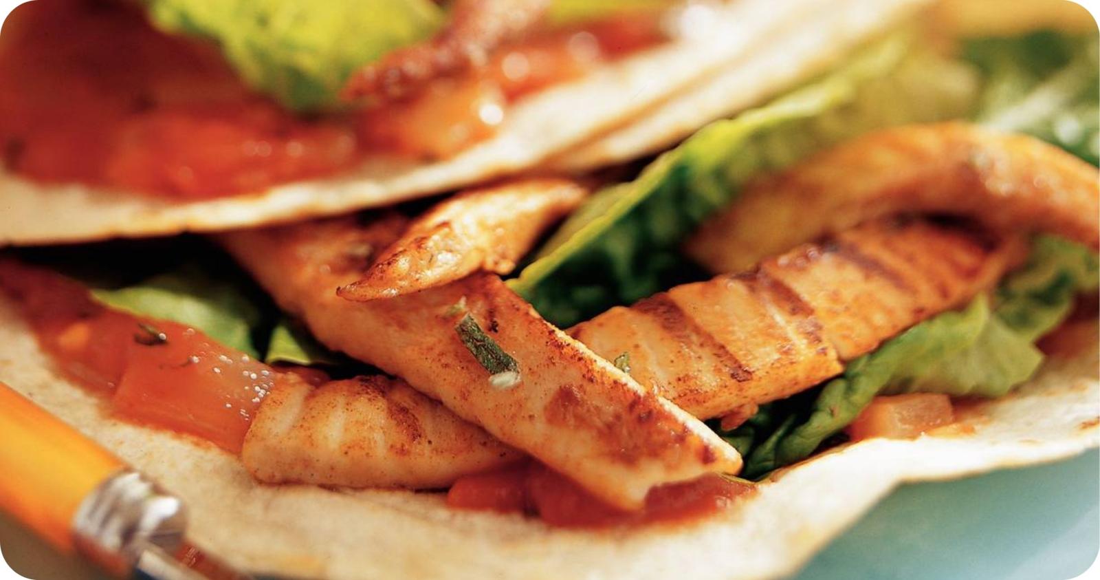 overal verkrijgbaar, bestaan uit knapperige tortilla's belegd met rundvlees, varkensvlees of vis.