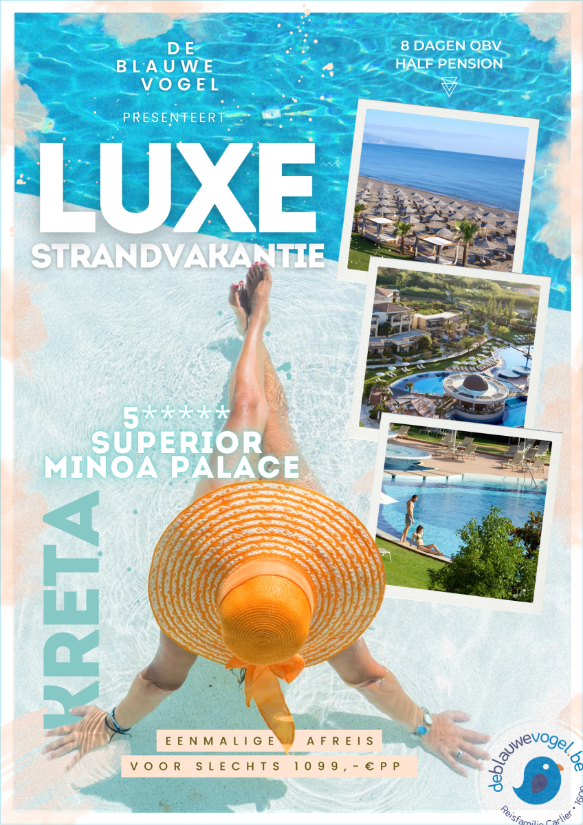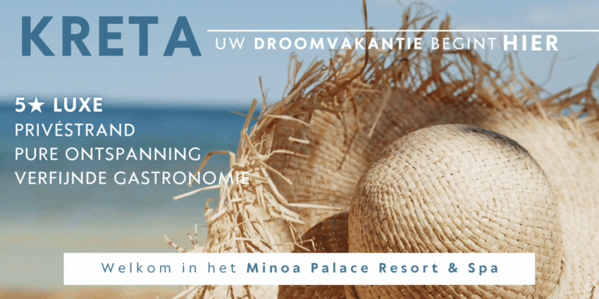 * Vliegreis vanuit Brussel heen / terug naar Chania (Kreta) * Transfers ter plaatse van en naar de luchthaven * Hotel ligt op slechts 25 km van de luchthaven! * 20 kg bagage pp * 7 kg handbagage pp * 8 dagen / 7 nachten * Tophotel Minoa Palace 5 * * * * * * Bijzonder verzorgde & lekkere halfpension ( uitgebreid ontbijtbuffet & elke avond verzorgd diner ) * Een prachtige Griekse vakantie : zalig !