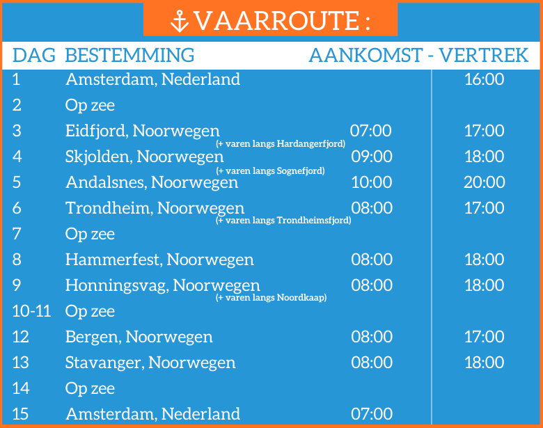 * 15 daagse cruise langs de mooiste aanleghavens van Noorwegen, fjorden en Noordkaap als hoogtepunt