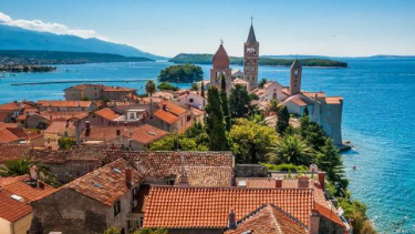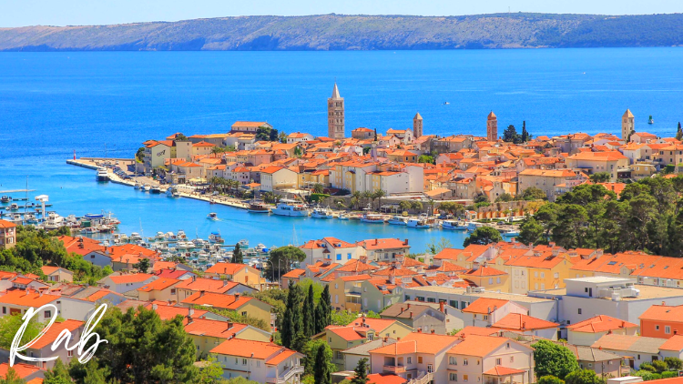 De oude binnenstad van Rab met haar markante klokkentorens strekt zich uit over een smalle, rotsachtige landtong die aan twee zijden omgeven is door water.