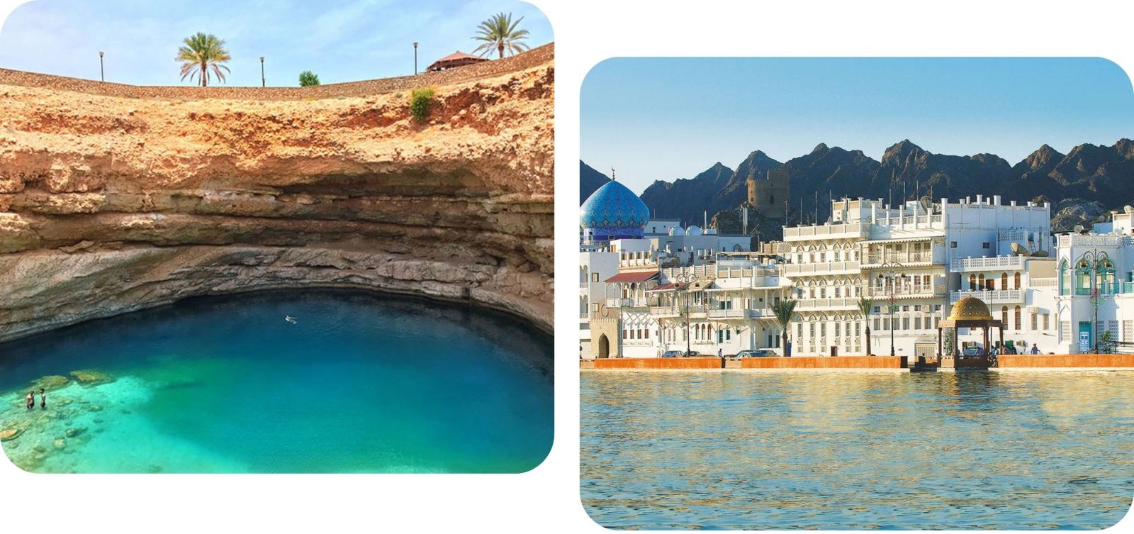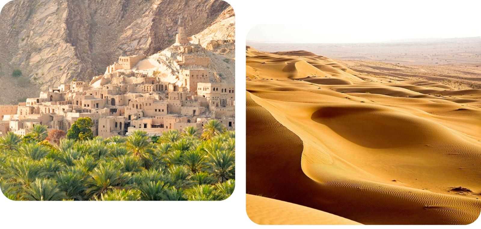Verder naar Oman, een nieuwkomer in de toeristische wereld, waar uitgestrekte zandwoestijnen, azuurblauwe valleien