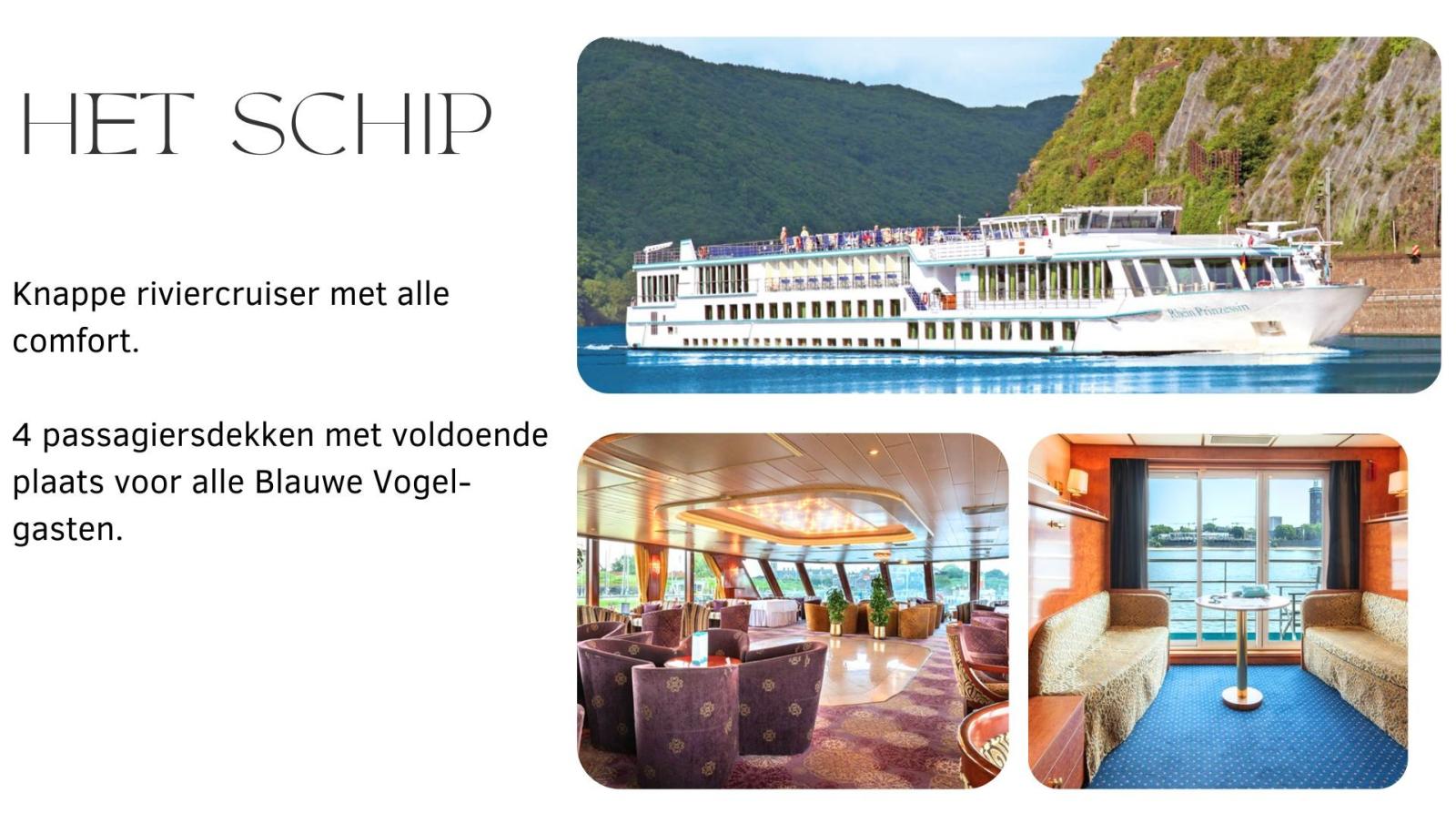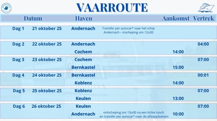 * Autocarreis heen / terug vanuit Vlaanderen * Cruise volgens vaarschema * Buitenkajuit met eigen douche en toilet * welkomst cocktail * Havengelden * Maaltijden op basis van VOLPENSION (!) * NL-talige menu's
