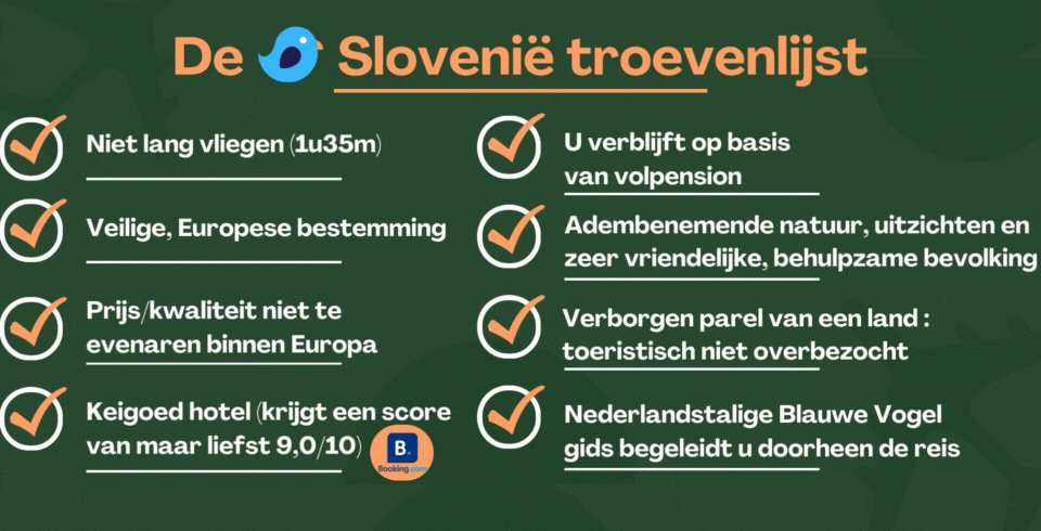 Slovenië heeft enorm veel troeven : knappe hotels, prachtige natuur, bijzonder vriendelijke bevolking & lekker eten. Daarbovenop is er veel te zien. Ontdek het nu !