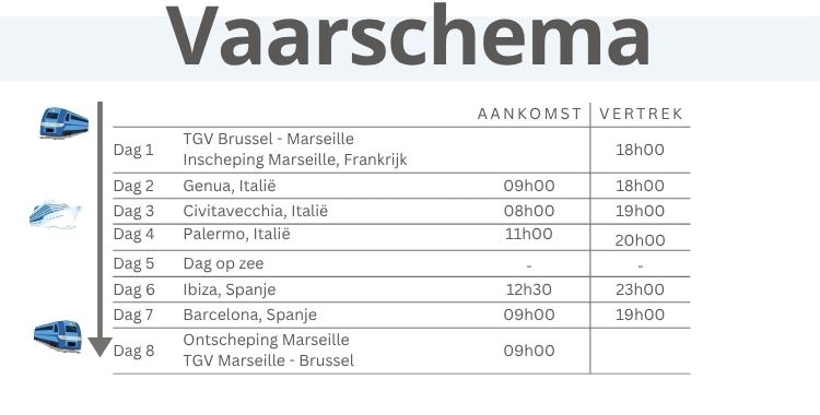 *TGV: Brussel – Marseille / Marseille – Brussel *Transport van en naar cruiseschip *8-daagse adembenemende cruise langs de mooiste aanleghavens van Italië en Spanje *7 nachten aan boord van het prachtige schip MSC Seaview *Nederlandstalige begeleider gedurende de volledige reis *Animatie, shows, fitnessruimte en entertainment aan boord *Volpension tijdens cruise (ontbijt, lunch, diner in het buffet- én a la carte restaurant) *Easy drankenpakket *Havengelden en Taxen *Fooien *Btw en garantiefonds