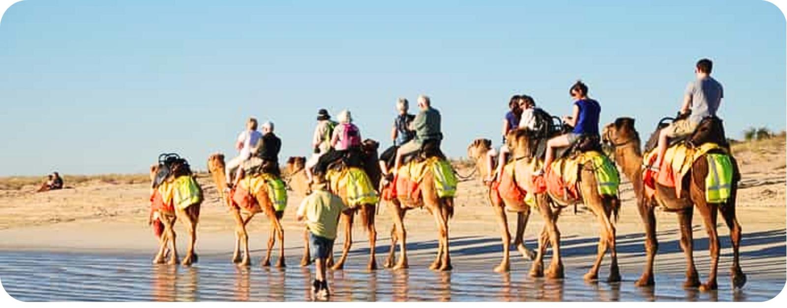 Dromedaristocht bij zonsondergang: Een unieke ervaring door de duinen of langs het strand.