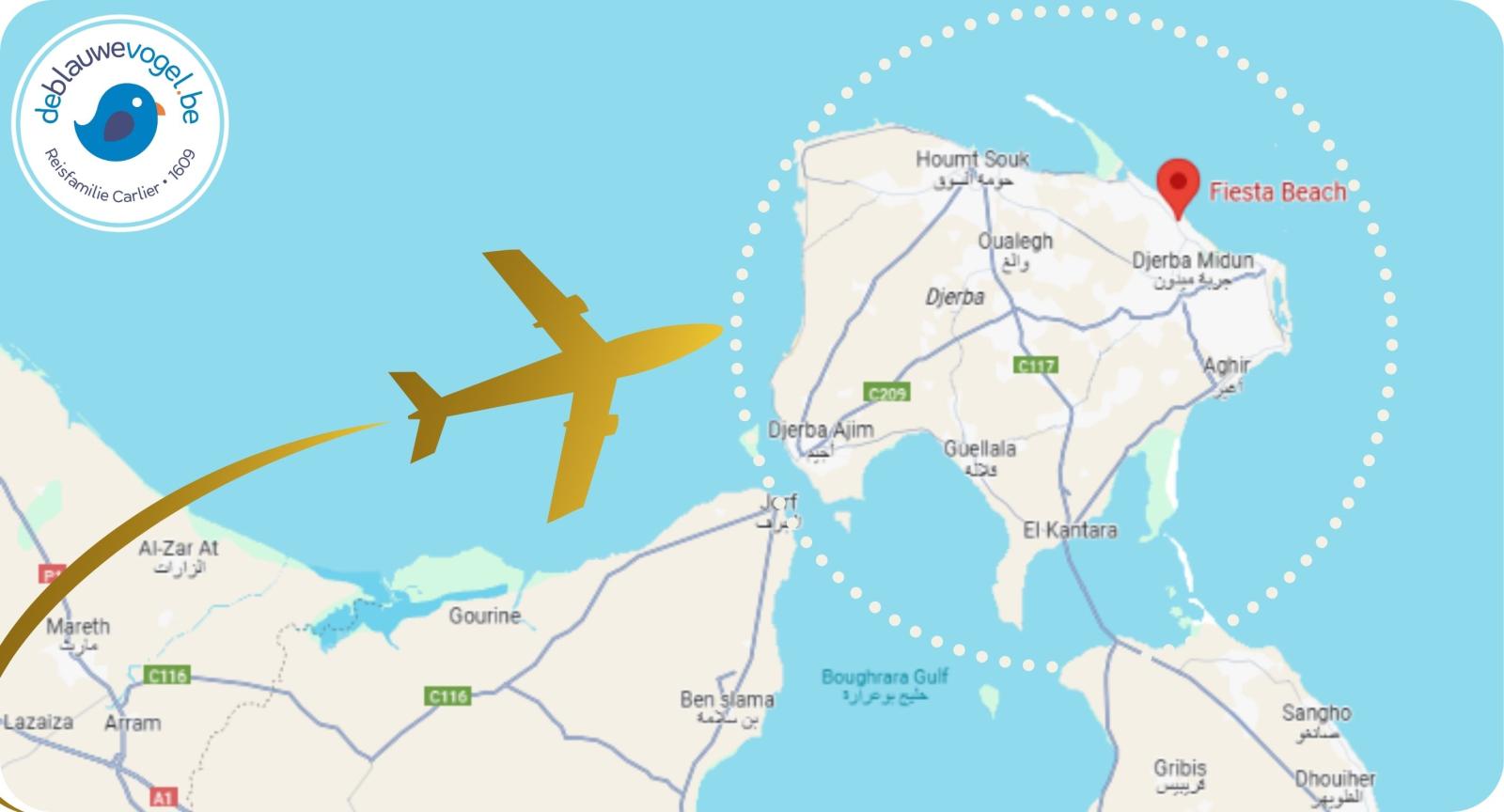 Het hotel ligt op ongeveer 25 km van de luchthaven, 15 minuten van Houmt Souk en 10 minuten van Midoun.
