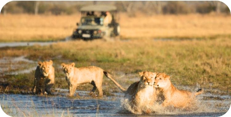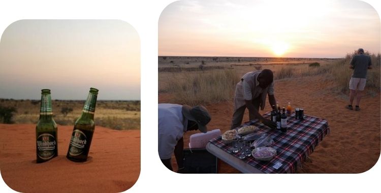 Net voor zonsondergang gaan we per jeep het park in om er, bij het gebrul van de leeuwen, te genieten van de zonsondergang en een aperitief.
