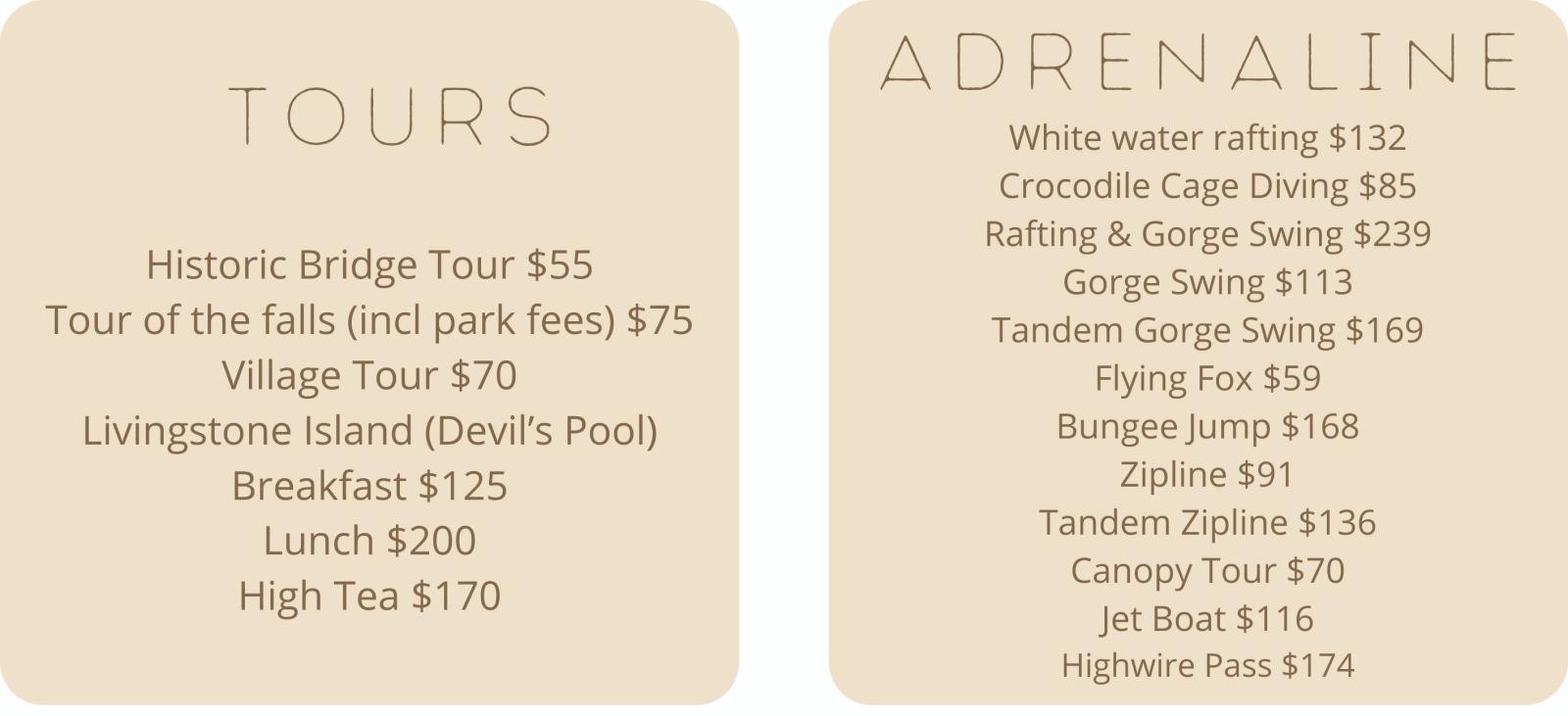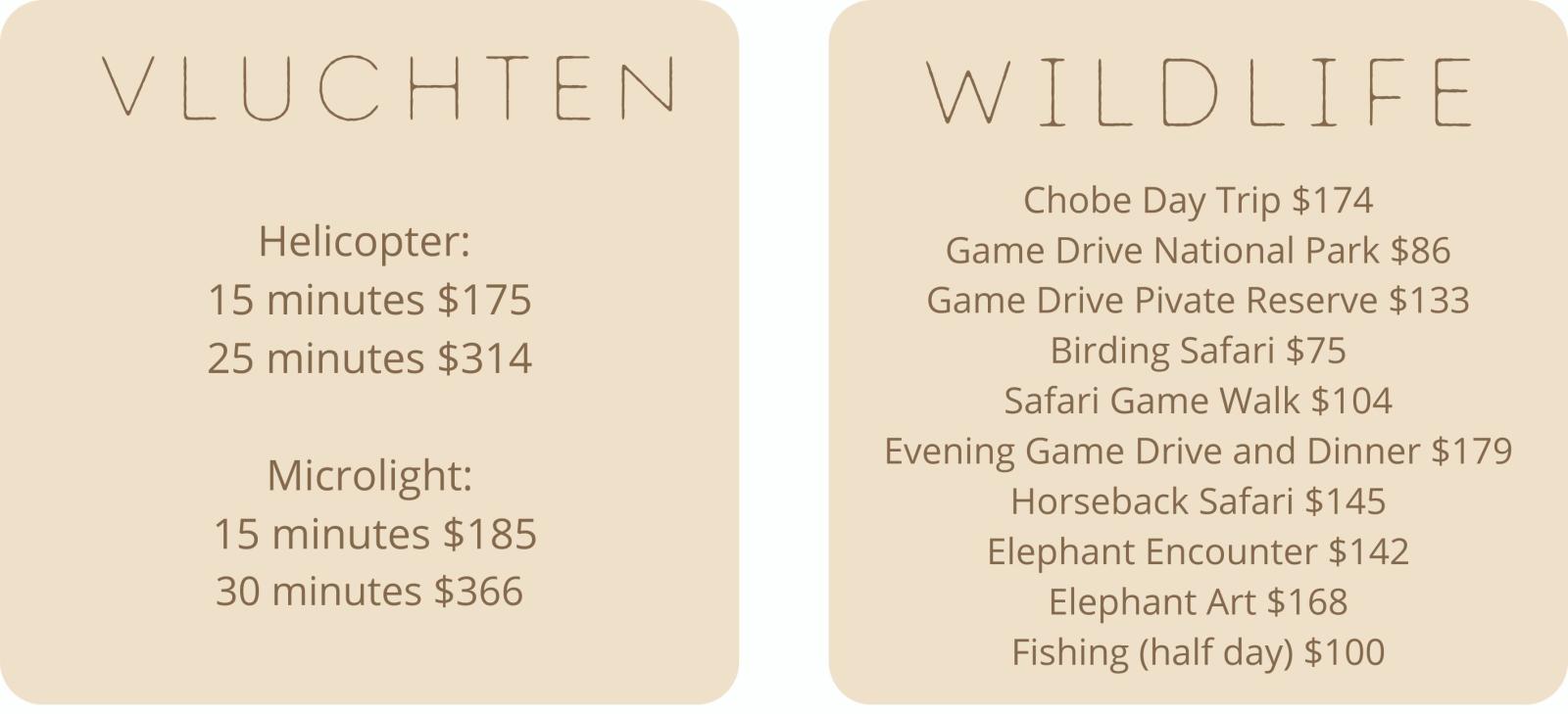 zoals een panoramische vlucht over de watervallen, rafting, rit op de rug van een olifant, enz….
