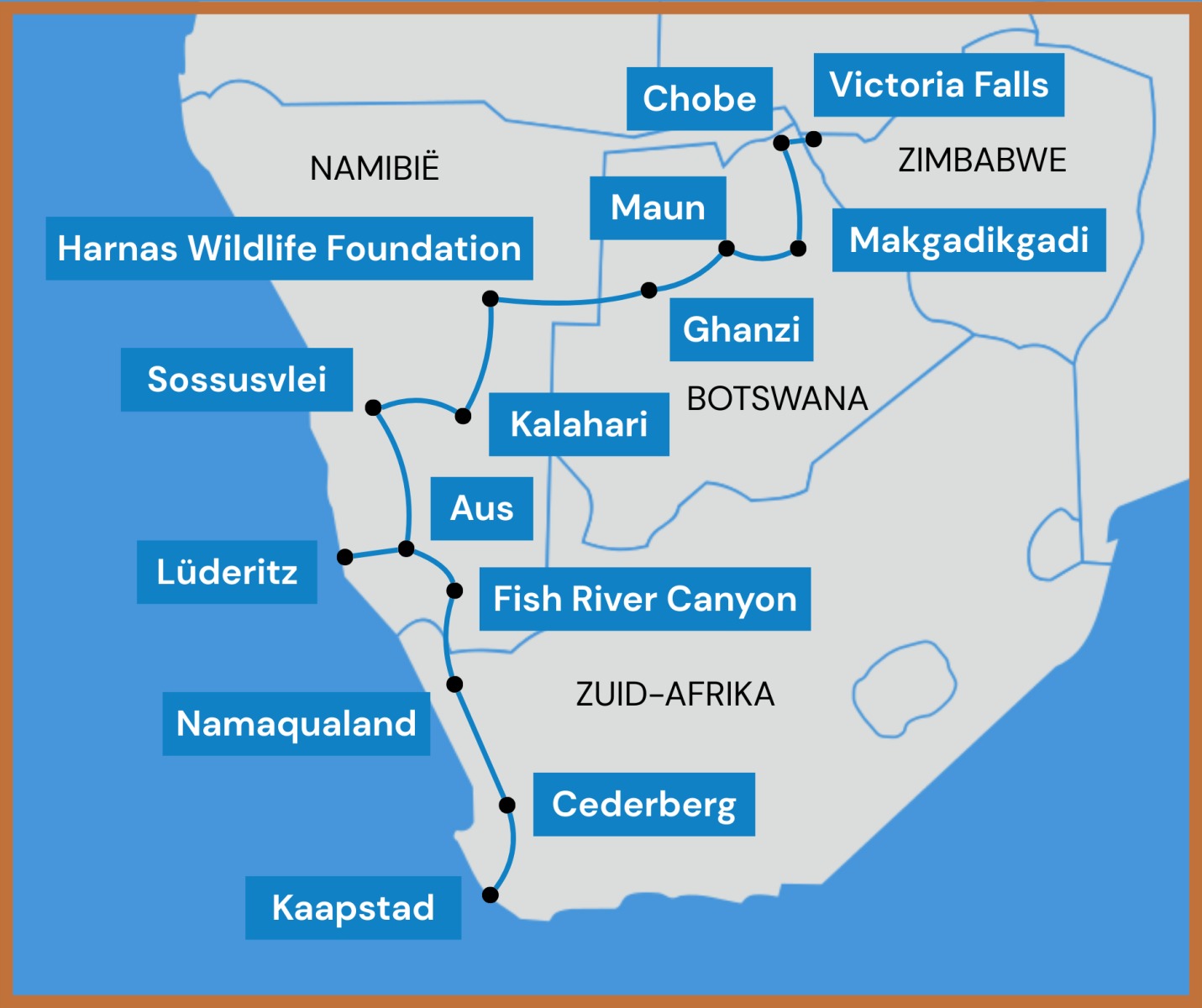 *Internationaal paspoort dat nog geldig is 6 maand na terugkeer *Zuid-Afrika : gratis toeristenvisum bij aankomst *Namibië: Visum verplicht. Online te regelen (kost: +/- 80 €) : u ontvangt hiervoor nog instructies via mail ong. 1,5 maand voor afreis *Zimbabwe : Visum verplicht (te regelen bij aankomst) Single Entry 30 USD per persoon. Enkel in cash te betalen en gepaste munt. Geen andere valuta toegestaan. Immigratieformulier verplicht online (u ontvangt hiervoor nog instructies bij de reisdocumenten)
