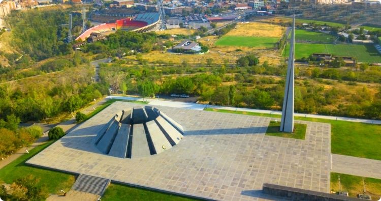 Na ons ontbijtbuffet zetten we ons bezoek aan Yerevan verder. We bezoeken het park van Dzidzernagaberd, de Zwaluwenburcht,