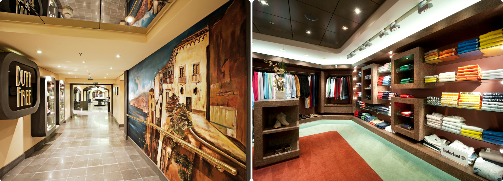(zoals Venchi 1878, Lavazza Coffee Shop, Jean Philippe Chocolate, Crepes & Gelato en de Starship Club).