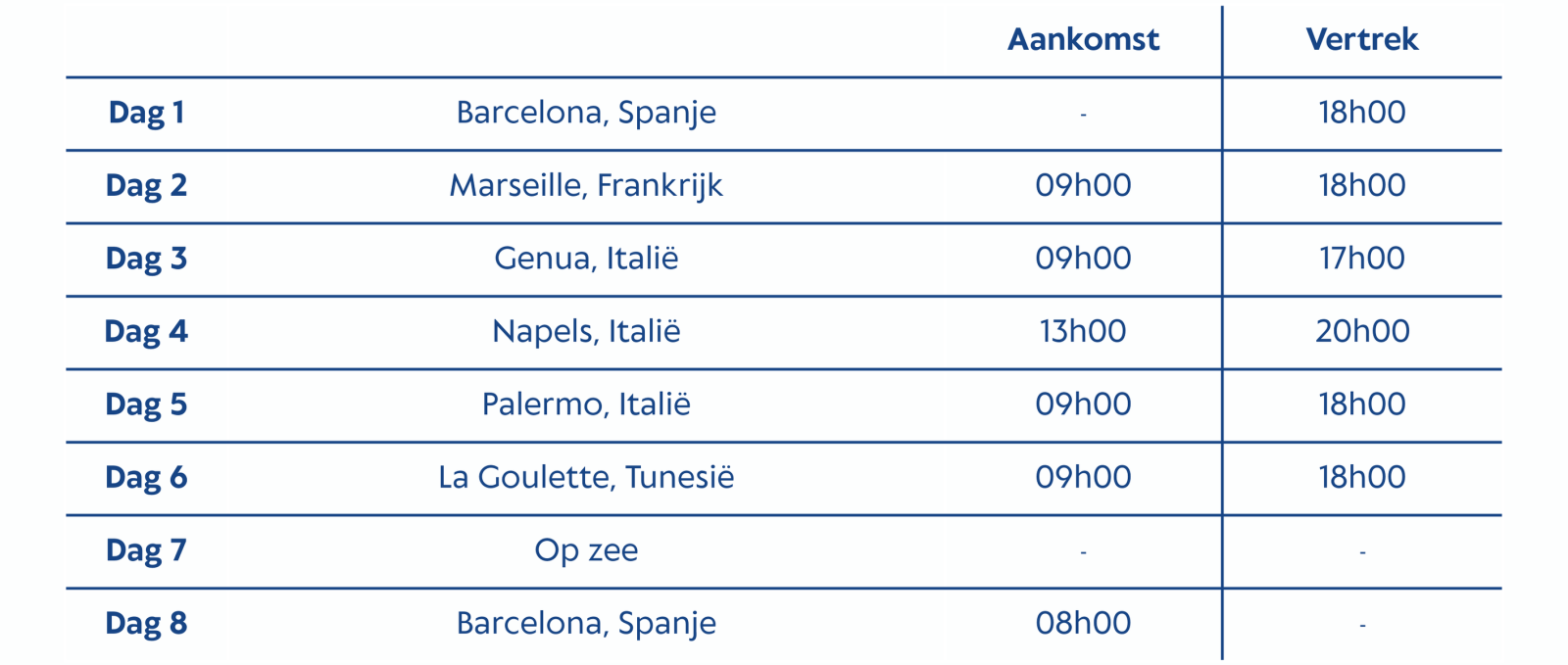 Het pakket geldt elke dag van de cruise (uitgezonderd de dag van ontscheping)