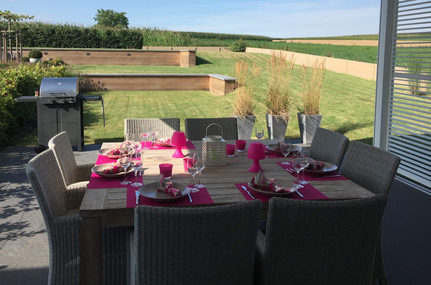 3 grote terrassen inclusief toffe tuinmeubels, overkapping Renson Camargue.