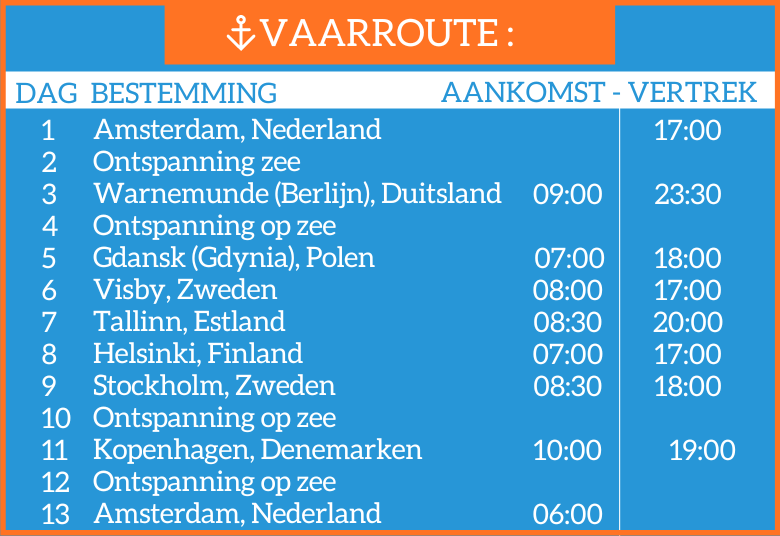 * Per autocar vanuit Oostende, Gent, Antwerpen, Hasselt en Groot-Bijgaarden heen en retour Amsterdam * Ervaren Blauwe Vogel begeleiding gedurende de volledige reis! * 12 nachten aan boord van het vernieuwde schip Celebrity Eclipse 5* * Cruise op basis van All Inclusive ( buffetten doorlopend open tot 22u) * All In drankenpakket : Classic Beverage Package * Gratis fooien (voor 1e en 2e persoon in de kajuit) * Gratis wifi voor (1 toestel per persoon) * Havengelden * Animatie ( binnen en buiten activiteiten) * Prachtige broadway shows aan boord * NL-talige, begeleide excursie / city tour in Tallinn! * VROEGBOEKAKTIE: BEPERKT AANTAL KAJUITEN AAN DEZE STUNTPRIJZEN.