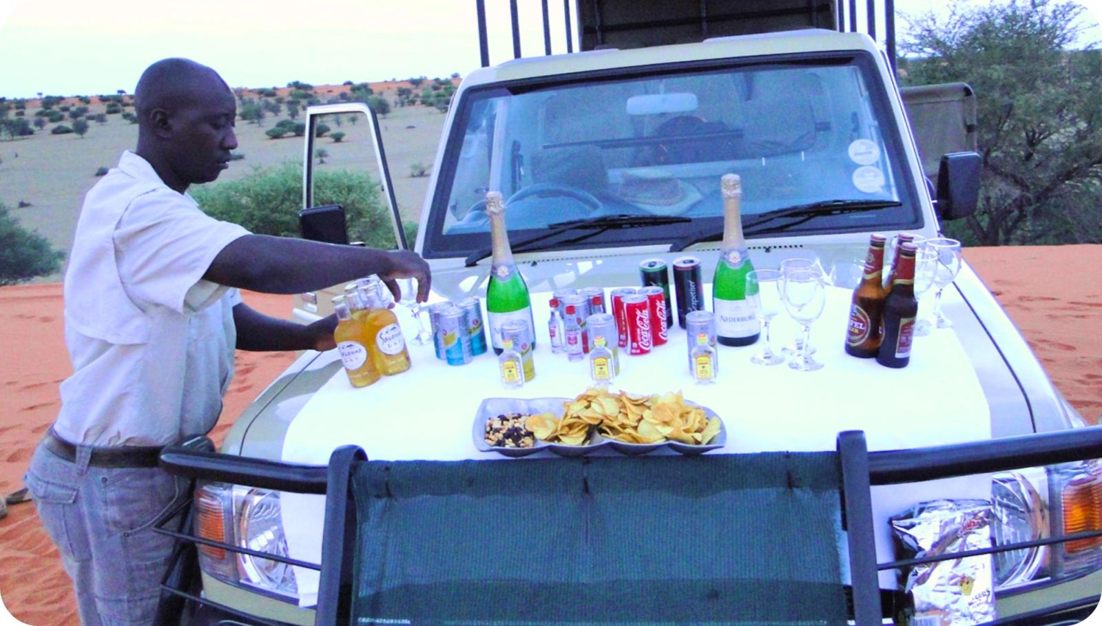 van de Afrikaanse wildernis te ontdekken terwijl de zon ondergaat en de nacht tot leven komt. Na een warme welkom