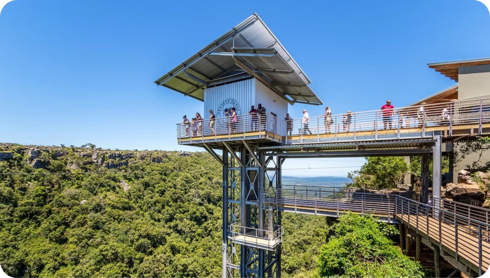 Een adembenemend avontuur staat ons te wachten bij de Graskop Kloof Lift. We stappen in een panoramische lift