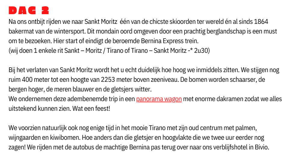 * Bernina Express treinrit Sankt Moritz – Tirano in panorama wagon