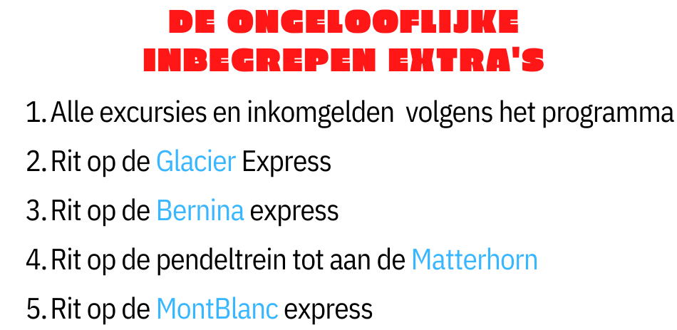 * Vluchten Brussel – Geneve – Brussel met Brussels Airlines * Touringcar ter plaatse gedurende het volledige verblijf * Ervaren Nederlandstalige begeleider/gids gedurende het volledige verblijf * 2 overnachtingen in hotel Solario Bivio*** of hotel Post Bivio*** op basis van halfpension * 2 overnachtingen in hotel Blatternhof*** op basis van halfpension * 2 overnachtingen in hotel Martigny Boutique*** op basis van halfpension * 6 ontbijten (elke dag van de reis) * 6 avondmalen (elke avond van de reis) * Alle vermelde uitstappen en ingangsgelden zoals vermeld in het programma * Bernina Express treinrit Sankt Moritz – Tirano in panorama wagon * Glacier Express treinrit Chur – Brig in panorama wagon * Trein Täsch – Zermatt – Täsch * Mont Blanc Express treinrit Martigny - Chamonix * BTW, huidige luchthaventaksen en garantieverzekering
